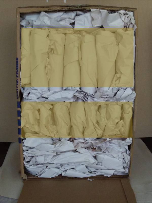 Compare the double thick dish pack to the normal thickness of the other cartons Highlighted areas are wrapped stemware or tall glasses (top), and wrapped Plates (bottom). Non highlighted areas are crumpled up paper used to fill the extra space inside a dish pack.